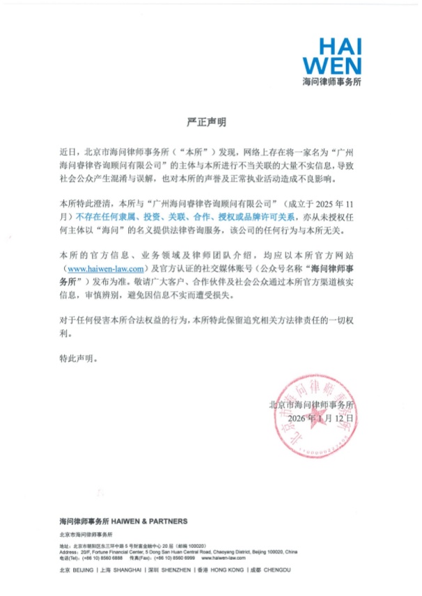 本所特此澄清,本所与“广州海问睿律咨询顾问有限公司”(成立于2025年11月)不存在任何隶属、投资、关联、合作、授权或品牌许可关系,亦从未授权任何主体以“海问”的名义提供法律咨询服务,该公司的任何行为与本所无关。
